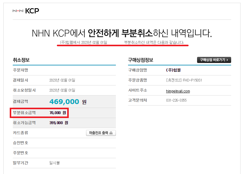 힘펠 본사에 통화를 하였으며 설치비용 70,000원을 부분취소 하였습니다.