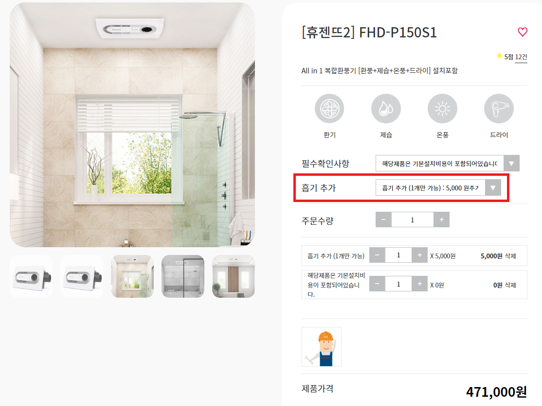 흡기 추가는 5,000원의 추가 요금(제품 옆면 추가 타공비용)이 발생하며, 기본설치 비용 70,000원이 포함된 금액입니다.